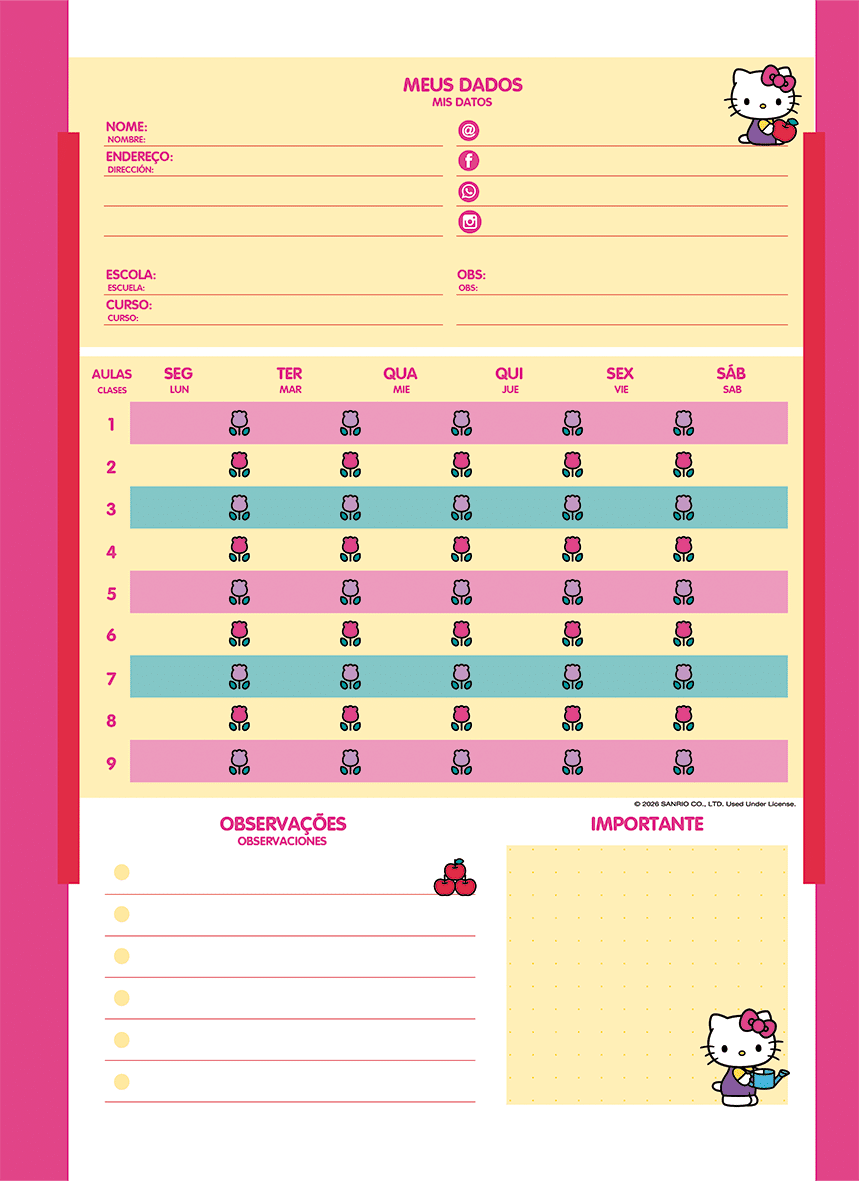 Organize seus estudos com o charme atemporal da personagem mais icônica da Sanrio! Este caderno é perfeito para quem precisa de espaço e organização, sem abrir mão de um design encantador e cheio de detalhes especiais.