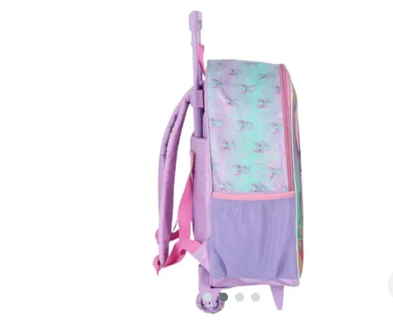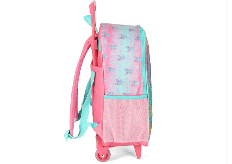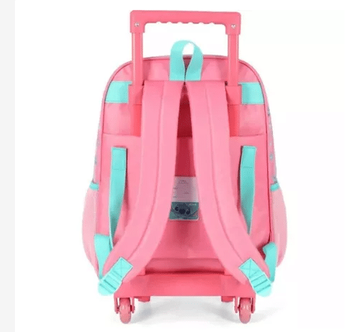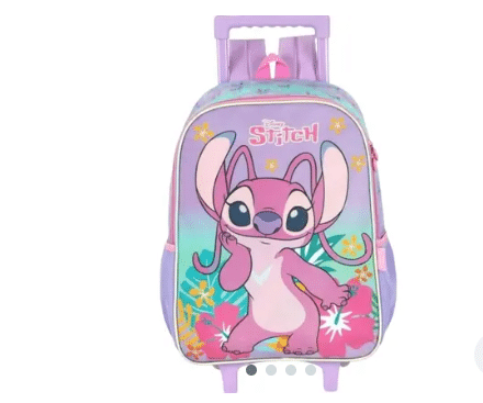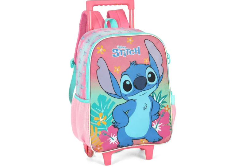 Mochila infantil com rodinhas e alça retrátil, estampada com o personagem animado Stitch em cores vibrantes. Possui design alegre e moderno, ideal para o dia a dia escolar ou pequenas viagens.