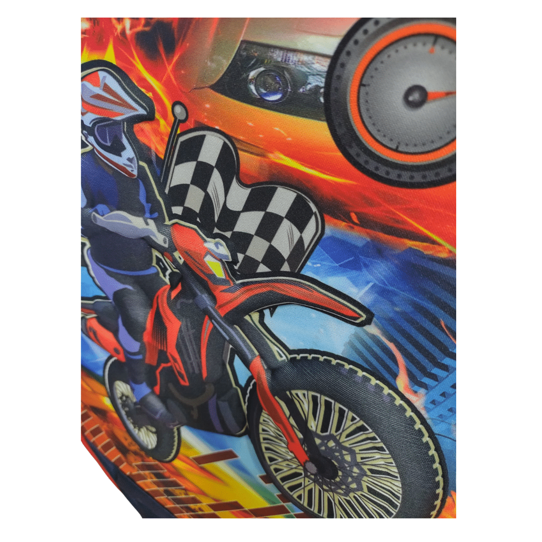 Design 3D Impactante: Estampas modernas com efeito visual diferenciado (temas de Motocicleta e Princesa/Borboletas) que se destacam no pátio da escola.